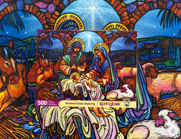Celebrate the true meaning of Christmas with this beautiful 500 piece jigsaw puzzle featuring a vibrant stained glass depiction of the Nativity scene. The puzzle captures the holy moment of the birth of Jesus, with Mary and Joseph lovingly gazing at the baby in the manger, surrounded by gentle animals under the shining star of Bethlehem. The rich colors and intricate details created by artist Lew Johnson, bring a sense of reverence and artistry to this timeless story. Perfect for the holiday season, this puzzle offers a meaningful and reflective challenge for all ages.