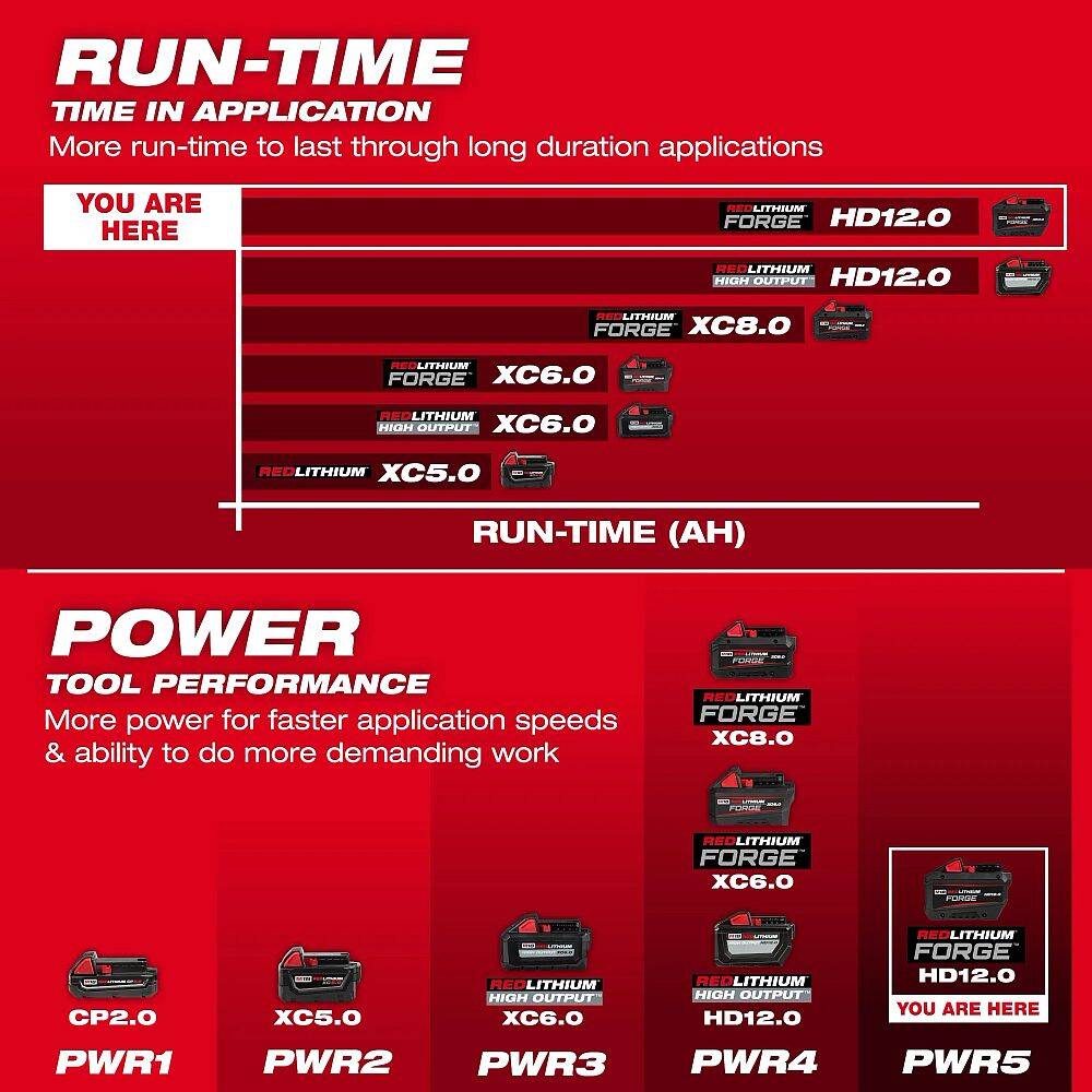 The M18™ REDLITHIUM™ FORGE™ HD12.0 Battery Pack delivers 50% more power than the HIGH OUTPUT™ 12.0, high-speed cooling for less downtime in high-demand applications, 35-minute supercharge to 80%, and the longest life vs REDLITHIUM™ batteries. REDLITHIUM™ FORGE™ are Milwaukee's most powerful, fastest charging, and longest life batteries. The M18™ REDLITHIUM™ FORGE™ HD12.0 is COOL-CYCLE™ capable. COOL-CYCLE™ Active Cooling System provides high-speed cooling for less downtime. Patented ingress coating provides increased protection to maximize active cooling through an upgraded venting design. The high-speed cooling feature works with M18™ chargers that have COOL-CYCLE™ capability. When paired with the M18™ Dual Bay Simultaneous Super Charger, this battery charges in just 35 minutes to 80%, getting you back to work faster than ever before. This lithium-ion battery has the longest life, the most recharges, and the best performance over the life of the battery. It is also designed with resistant housing for increased protection against exposure to common oils, greases, and solvents. Built-in REDLINK™ Intelligence protects the battery from overloads, preventing you from damaging your cordless power tools in heavy-duty situations. The REDLITHIUM™ FORGE™ HD12.0 battery is fully compatible with 250+ M18™ solutions.