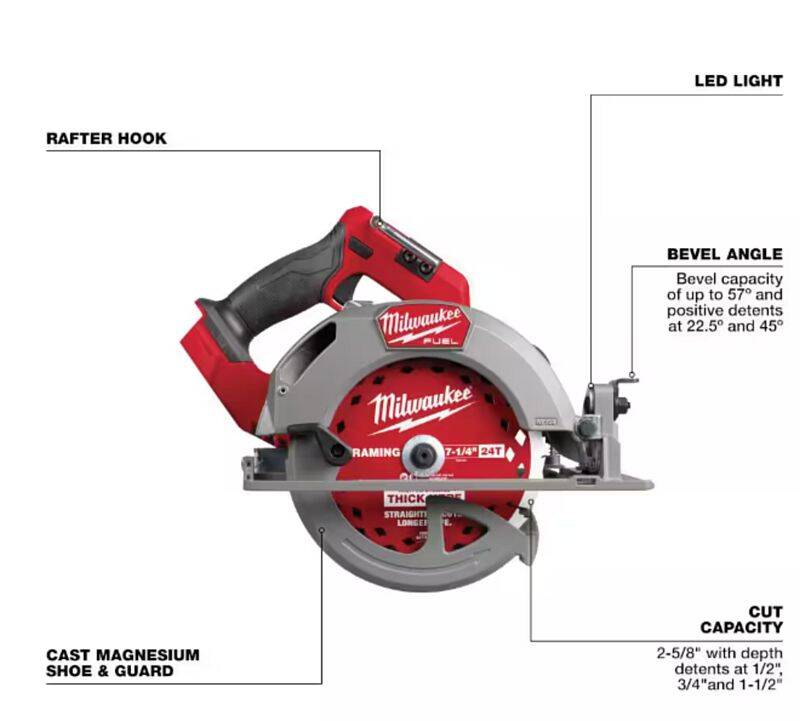 Our M18 FUEL™ 7-1/4” Circular Saw is designed for the professional carpenter, remodelers, and general contractors who rely on high-performing and durable tools. Leveraging the latest in cordless technology, this saw offers class-leading performance, providing the power to complete more demanding applications and the cut speed to achieve greater productivity. The POWERSTATE™ Brushless Motor delivers 6,000 RPM, maintaining high speed under load, providing users the ability to complete their most demanding applications efficiently. The latest in REDLINK PLUS™ Electronics ensures maximum tool performance and protection from overload, overheating, and over-discharge. When paired with an M18 REDLITHIUM™ FORGE™ HD12.0 Battery this saw delivers 750 cuts per charge and is fully compatible with all M18 REDLITHIUM™ batteries. The ergonomic, compact, and lightweight design makes the saw a perfect solution for all-day cutting. Positive bevel detents and depth detents offer added productivity and reduce downtime. Additionally, the saw has an electric blade brake, LED work light, rafter hook, and all magnesium guards and shoes, keeping the user productive and providing the durability to handle the toughest job site conditions.