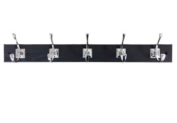 This transitional hook rack features 5 coat hooks in a stylish finish affixed to a board. The dual arm design doubles your storage potential and will satisfy all of your organizing needs. This elegant hook rack blends well with a variety of décors and will enhance any room with its sophisticated charm.