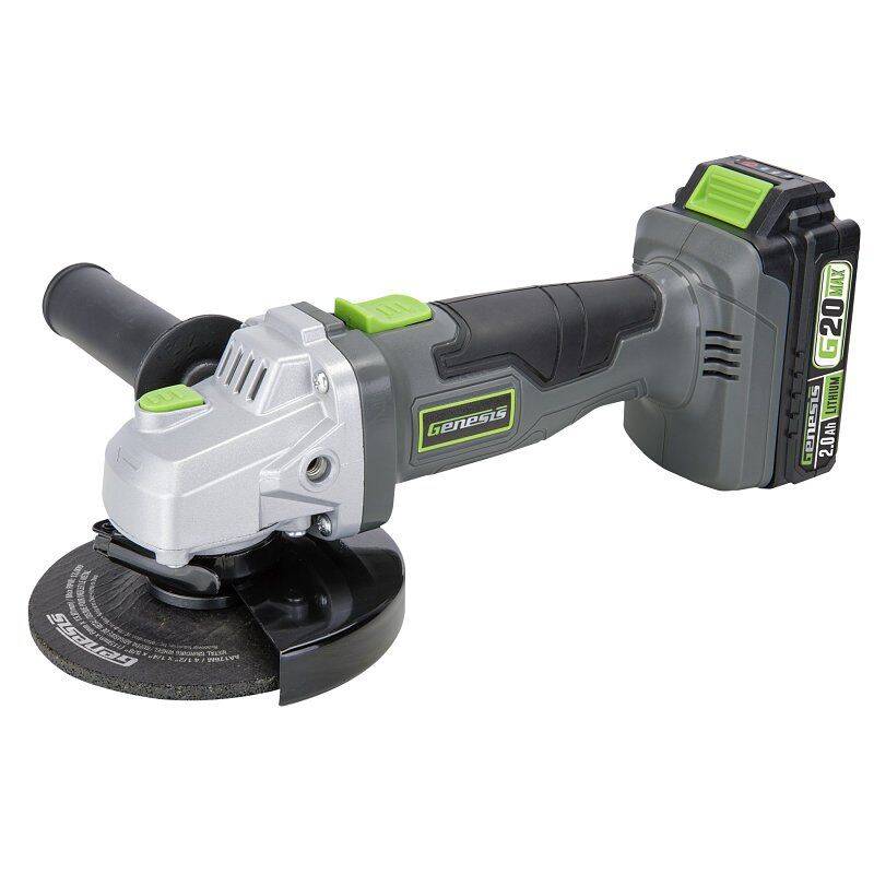 Genesis G20Max Angle Grinder. This tool features a user-friendly barrel-grip design for enhanced comfort and control during extended use.