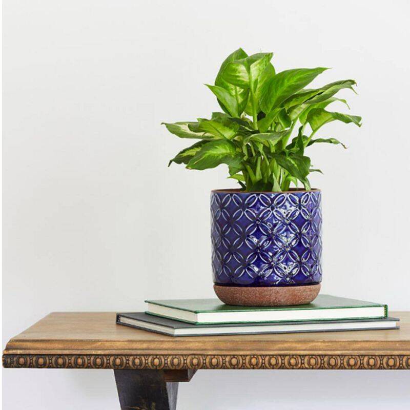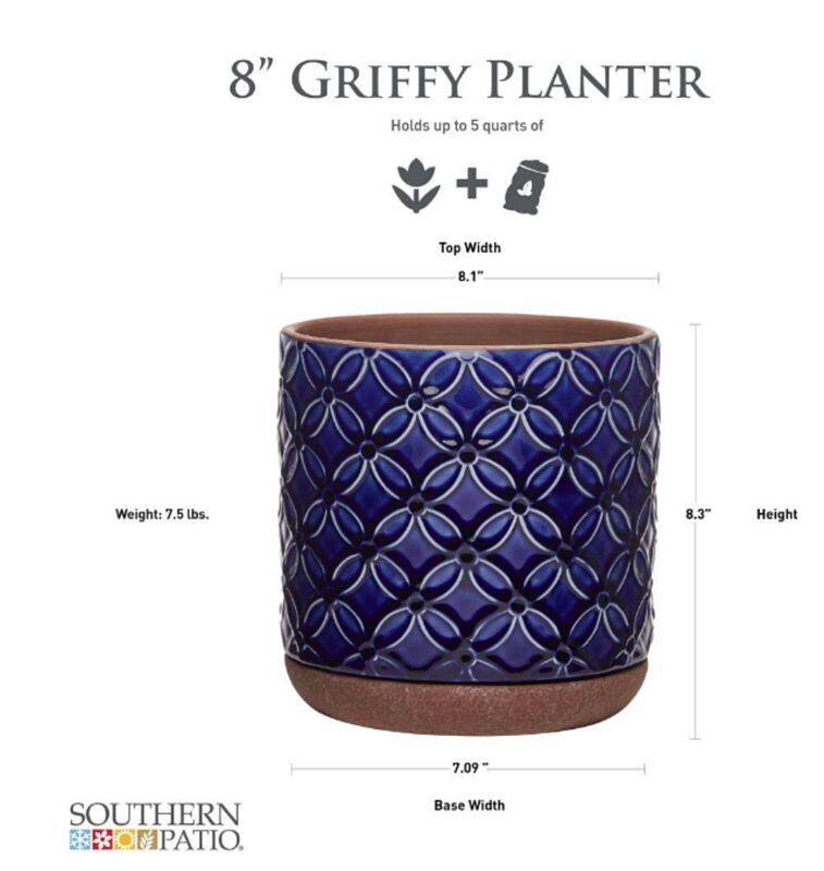 Customers say the Southern Patio® Griffy blue ceramic pot is a beautiful and well-made planter that enhances home decor with its vibrant color and glossy finish. Many appreciate its functional design, including the built-in drainage hole and saucer, which helps maintain plant health. While most users find it sturdy and versatile for both indoor and outdoor use, some have noted minor issues with chipping and alignment. Overall, it is considered a great value for its quality and aesthetic appeal.