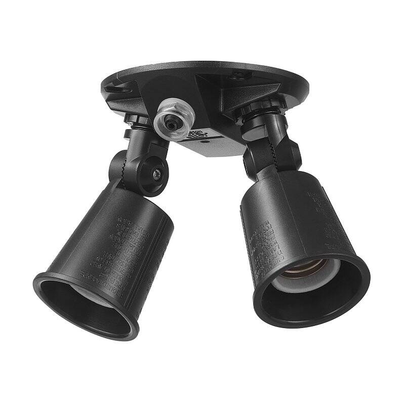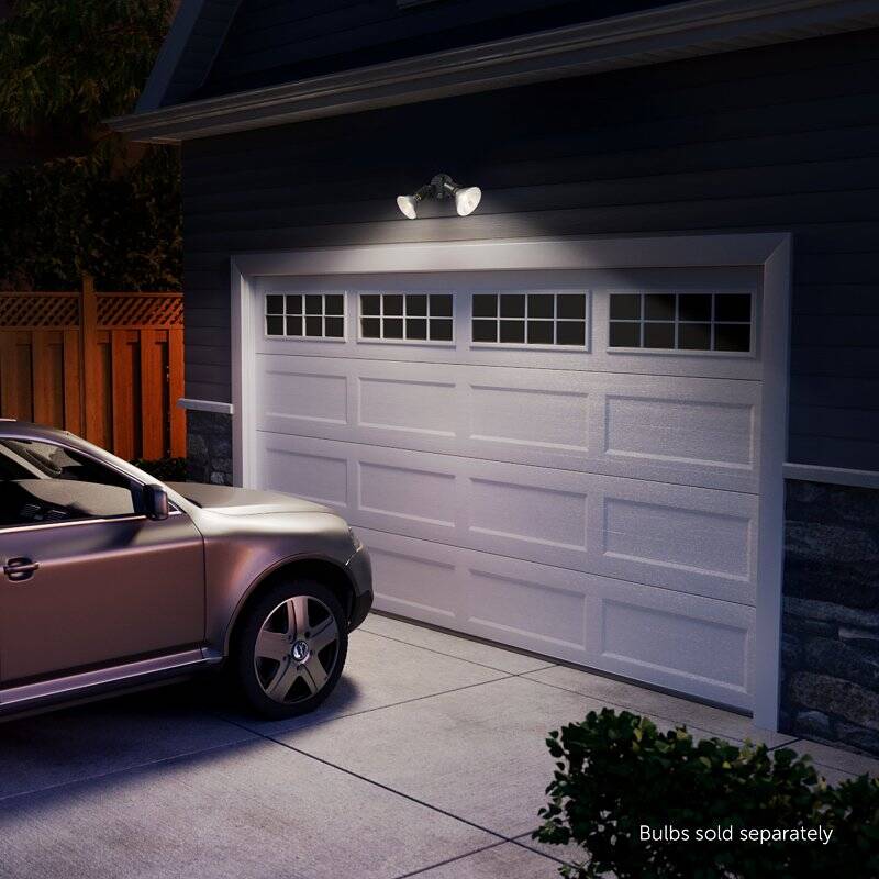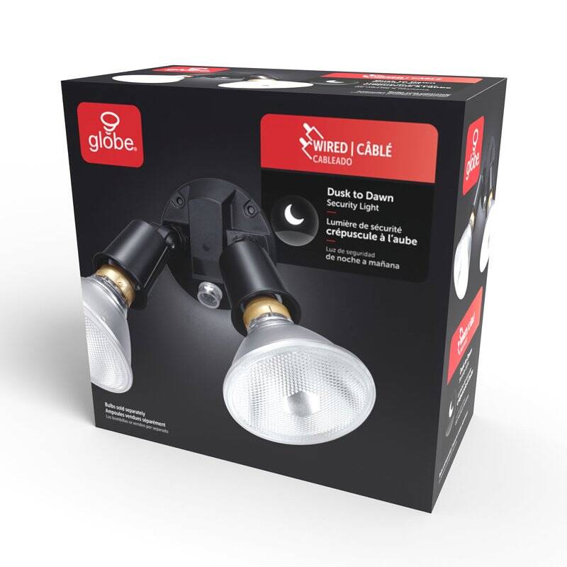 Upgrade your outdoor spaces with the dusk-to-dawn swivel arm security light. Designed for safety, convenience and cost savings, it features a built-in photocell for automatic dusk-to-dawn operation, saving energy and money. The swivel arm design allows easy adjustment of lamp heads for customized light coverage. Use 2X standard base E26 PAR38 shape 120 W max bulbs. Install effortlessly with the dual-mount system which included all mounting hardware to give you the option to wall-mount or eave-mount and enjoy its weather-resistant, durable construction. Ideal for pathways, sheds, garages and more. Backed by a 2 year warranty, you can trust in the GLOBE ELECTRIC commitment to quality. Illuminate your surroundings confidently with this versatile security light.