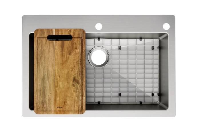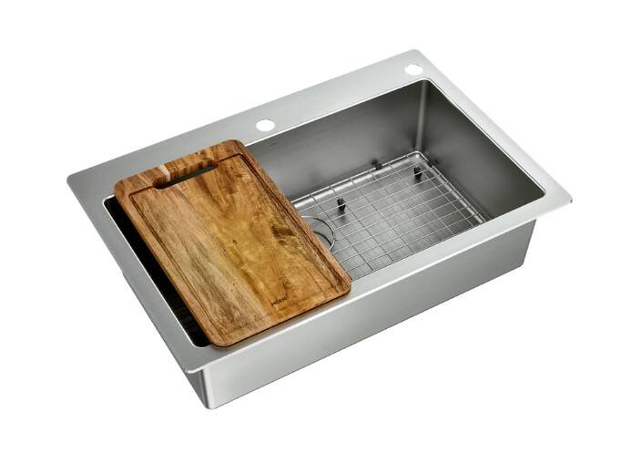 | Includes | Stainless steel sink bottom grid, Acacia wood cutting board, Drop-in hardware for top-mount installation |