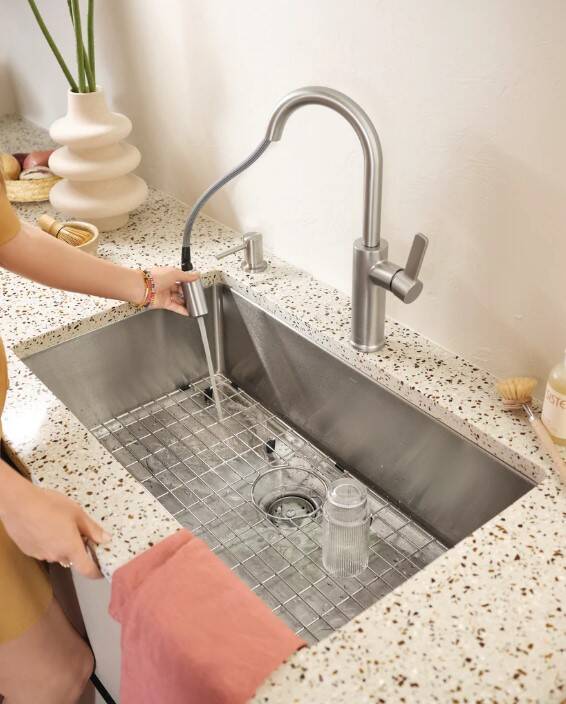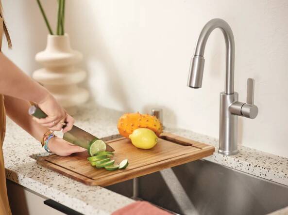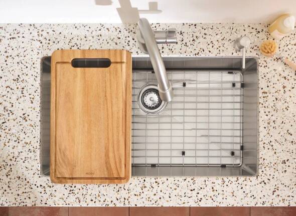 The ISLET™ workstation kitchen sink elevates culinary experiences in the kitchen by enhancing workflow and streamlining kitchen tasks. Unlike other workstation sinks, ISLET™ offers more sink space by eliminating the built-in ledge. The workstation sink bundle includes a high-quality, single bowl stainless steel basin perfect for holding large pots and pans, a bottom sink grid and an acacia wood cutting board. Both accessories are tailored to fit the sink perfectly, no matter your installation preference. Featuring dual mount installation, the sink can be installed above or underneath the countertop for added flexibility. Additionally, Moen’s SoundSHIELD™ system reduces vibration and noise caused by running water and dishes. ISLET is a perfect option for at-home chefs by allowing food prep and chopping to be completed right over the sink, simplifying chores and cleanup, and optimizing kitchen space.