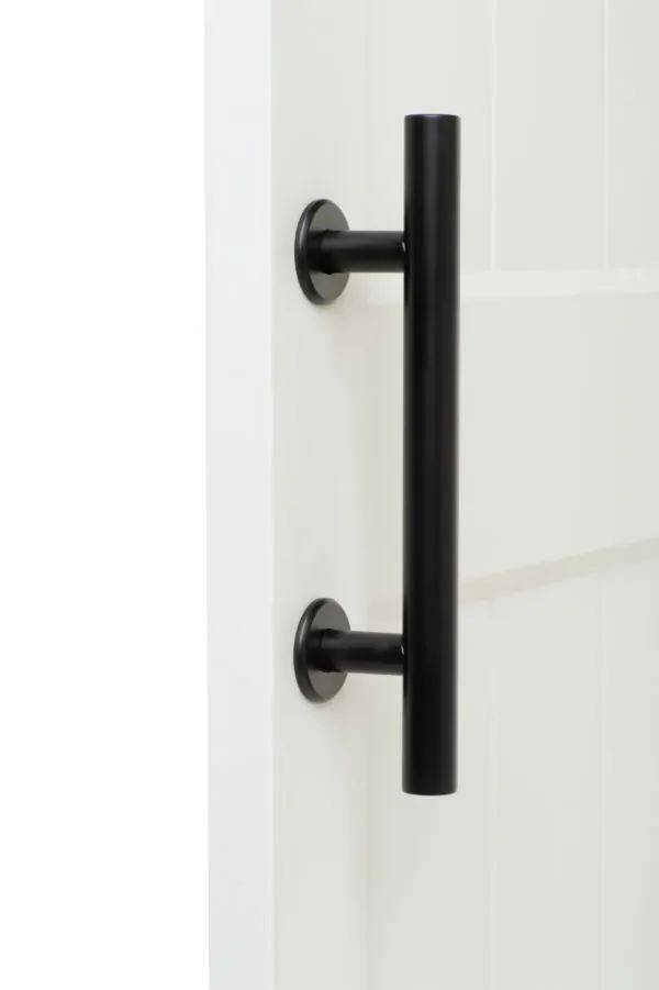 Tubular handle and rectangular pull barn door hardware design.