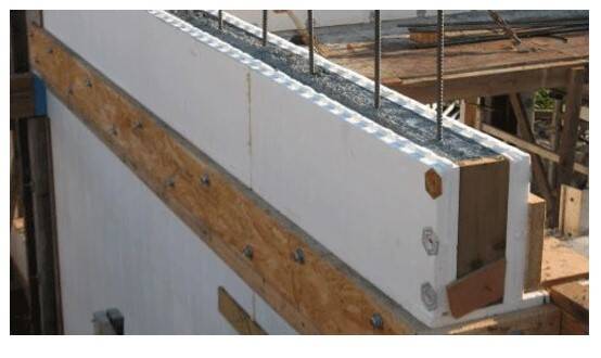 Each ICF block comprises two Styrofoam Expanded Polystyrene (EPS) foam sides joined together with six robust and full-length injection molded plastic ties. The blocks are stacked tightly and interlock end to end to the desired wall length.