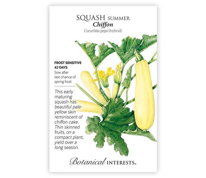 "Chiffon" boasts all the qualities of a perfect summer squash. With high yields, it will produce nearly all summer, starting earlier than most varieties. Fruits grow on upright, compact bushes approximately 2 feet tall and 3-4 feet wide with moderate resistance to powdery mildew. The creamy-yellow skin is very delicate, lending to excellent flavor and texture. Summer squash can be picked extra small giving your dishes a high-class flare or picked at a more mature stage between 6-8 inches long.