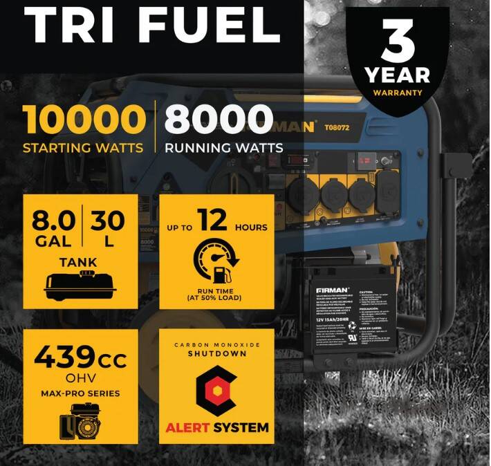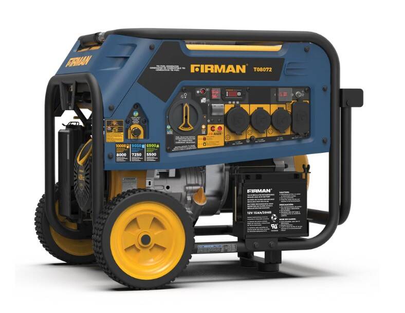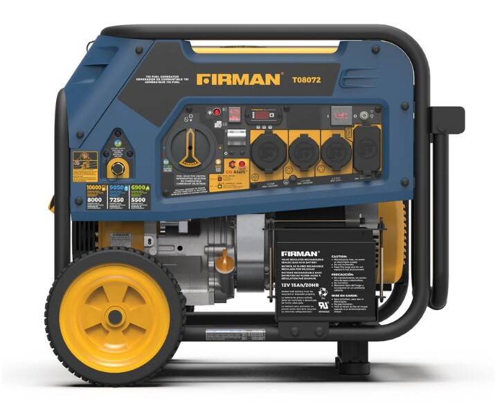 The FIRMAN T08072 Tri-Fuel generator is a trifecta that can run on gasoline, propane, and natural gas.