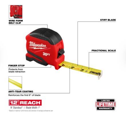 The 30ft Compact Tape Measure delivers a stiff blade and fractional scale, allowing for quick measurements. With an anti-tear coating that reinforces the first 6” of the blade and an impact resistant body, this tape withstands jobsite conditions. The Compact Tape Measure’s finger stop protects from blade retraction. This tape measure features 12’ of Reach and 9’ of Standout, allowing you to take long measurements on your own.