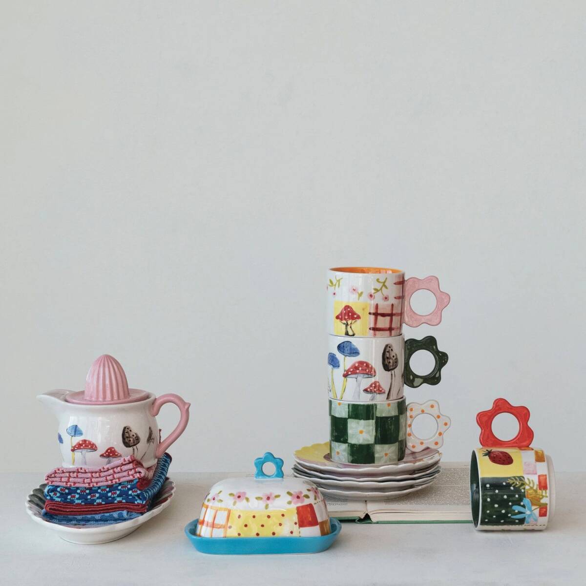 This hand-painted stoneware juicer/pitcher is sure to add some whimsy to your kitchen.