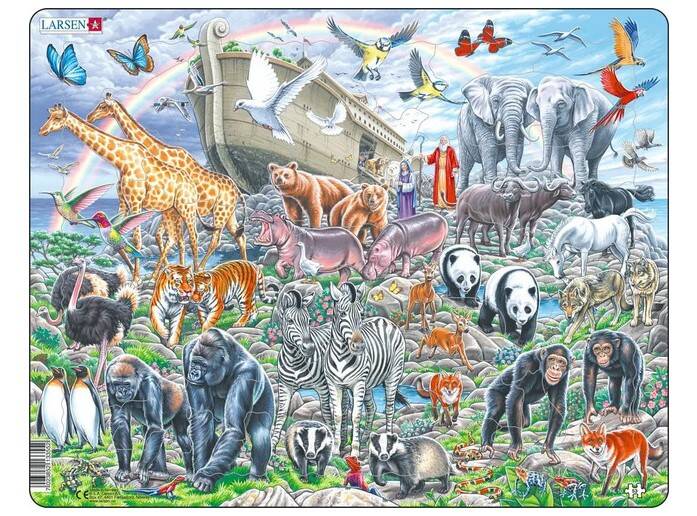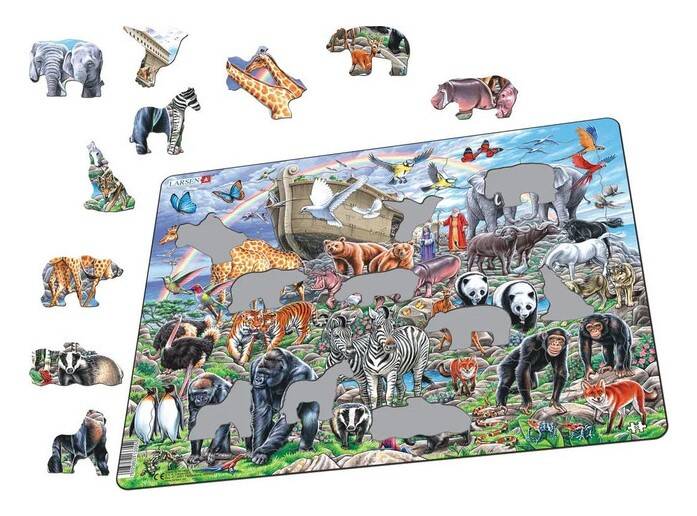 Noah's ark is stranded on Mount Ararat and Noah is watching animals from all over the world go ashore, happy that they have solid ground under their feet. Everyone seems to be friends, they do not try to eat each other. Soon, most of them will embark on a long journey, returning to the continents they came from, Africa, America, Asia, Antarctica, Europe, and Oceania. The puzzle has 53 pieces, and some of the pieces are cut out along the contours of the picture. Many of the puzzle pieces are shaped like animals that were in the ark, dove, elephant, bear, hippopotamus, wolf, gorilla, horse, badger, fox, and panda. The puzzle is best suited for slightly older children. Noah's ark with animals from all over the world on Mount Ararat.