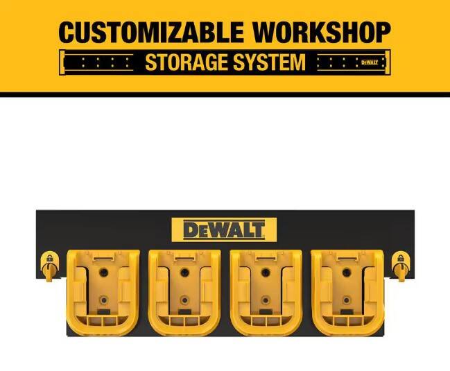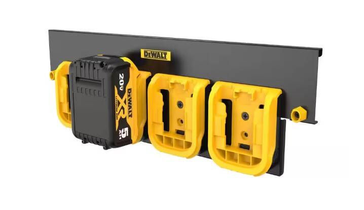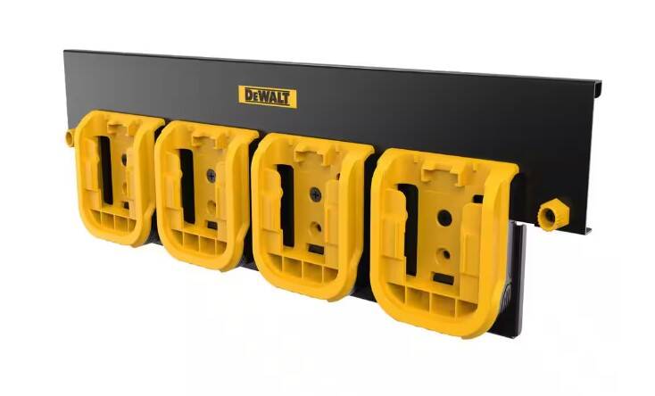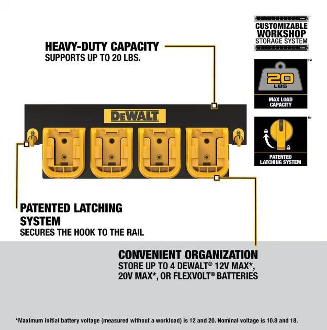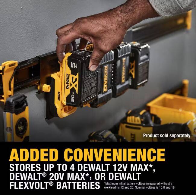 The DEWALT Battery rail is part of the DEWALT Workshop Storage System and mounts directly to DEWALT Metal rails. It provides a convenient storage solution for up to four DEWALT 12V MAX, 20V MAX, or FLEXVOLT batteries. The Metal rail includes 4 battery cleats, each with up to 5 lbs weight capacity, for a total rail weight capacity of 20 lbs to support a wide variety of DEWALT batteries. It also features a patented latching system that secures the hook to the rail.