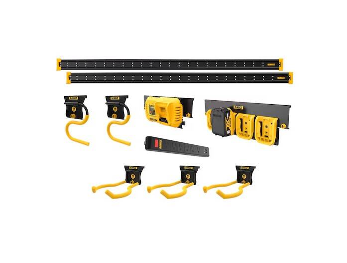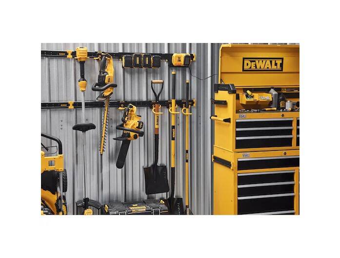 The DEWALT Lawn and Garden Storage Kit is a great way to start organizing your Lawn and Garden Tools! It includes two DEWALT 48in Metal rails, each with a load capacity of up to 100 lbs per lineal foot. It also includes a variety of DEWALT Workshop Storage Accessories, including three outdoor power equipment hooks, three long handled tool hooks, one battery charger rail mount, one battery rail, and one magnetic power strip. All accessories can easily attach to the DEWALT Metal rails and feature a patented latching system that secures the hook to the rail.