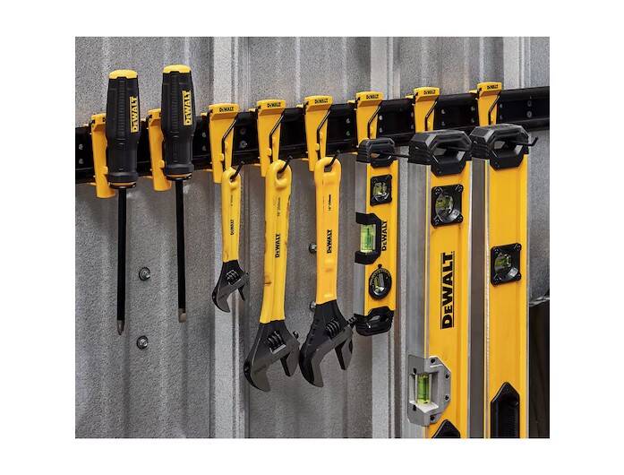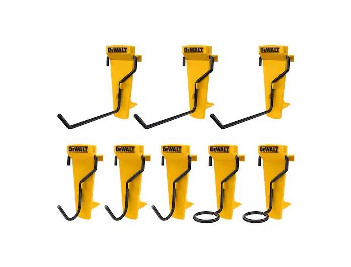 The DEWALT 8pc Hand Tool Hook Set is part of the DEWALT Workshop Storage System and mounts directly to DEWALT Metal rail. It includes three different hook types to help store a variety of different hand tools and accessories. The hooks snap easily onto the DEWALT Metal rail for easy installation. They are constructed of heavy-duty composite plastic for a weight capacity up to 5 lbs per hook to support a wide variety of hand tools and accessories.