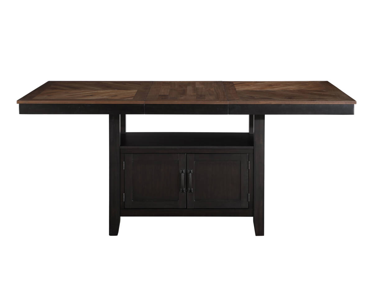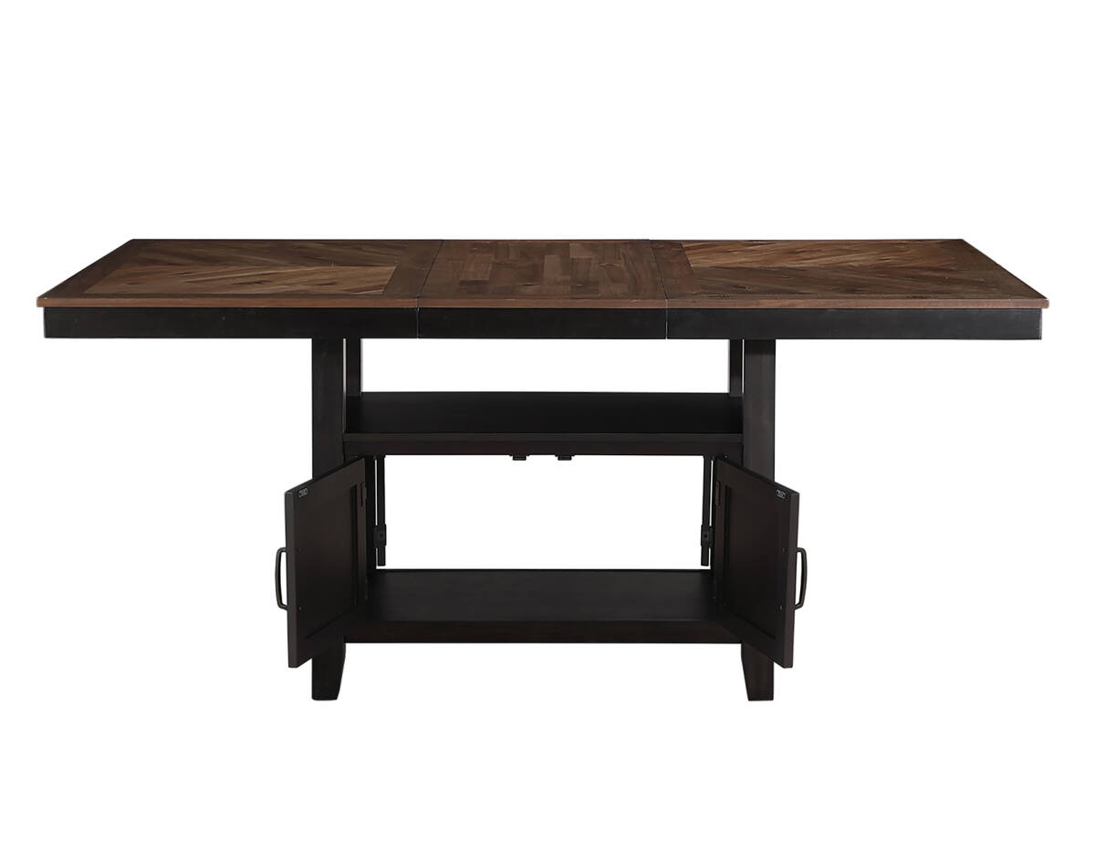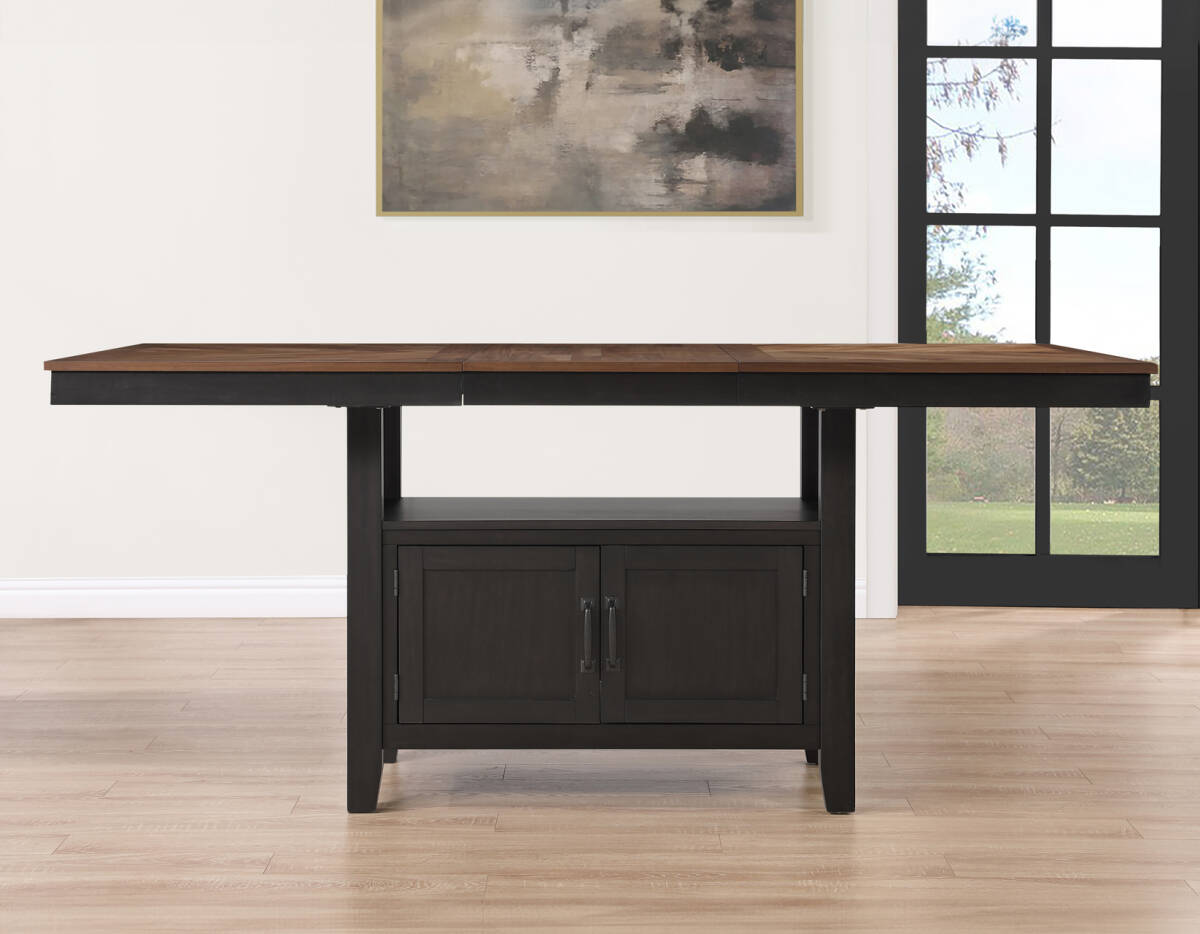 The Bermuda 60-80 Inch Storage Counter Table with 20 Inch Leaf offers modern farmhouse style with a contemporary edge. Featuring black and dark acacia finishes over acacia veneers and hardwood solids, this 36-inch high table is perfect for dining or working. The 20-inch leaf effortlessly converts it from a cozy 60-inch table to a spacious 80-inch one, accommodating up to eight guests. Tapered legs add elegance and stability, while the base provides generous storage with dual doors on both sides for easy access to essentials.