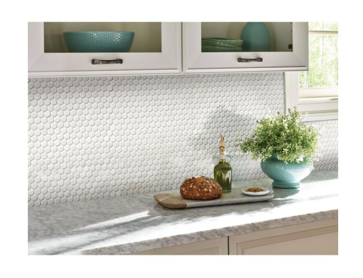 White Glossy Penny Round are porcelain mosaic wall tiles with a retro feel. The white penny round pattern with glossy finish can be more dramatic with a contrasting grout or textural with grout in the same color. The durable tiles are Greenguard Indoor Air Quality Certified for peace of mind and perfect for residential and commercial flooring as well as residential countertops and wall applications. They also pair well with a wide variety of subway tile, arabesque tile, or ceramic wall tile from MSI's inventory.