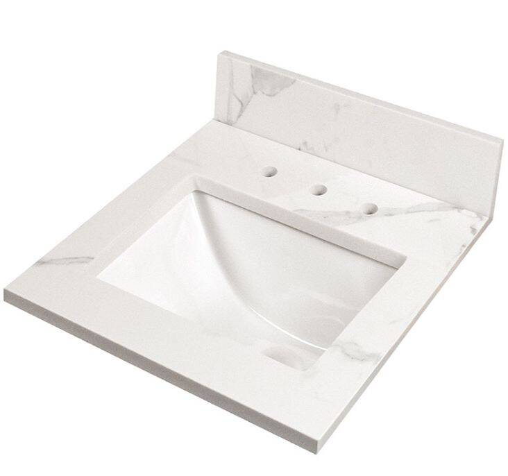 Create a luxurious bathroom with a Calacatta Nowy marble look vanity top. A cool white background complemented by light gray veins provides a serene aesthetic and can work with any architectural style. This durable vanity top comes with an integrated rectangular sink for a sleek look and pre-drilled holes for easy faucet installation. Ideal for remodels or new-builds, this engineered marble vanity top comes with a matching backsplash to help protect walls,.