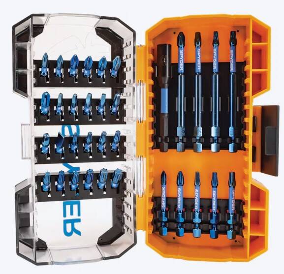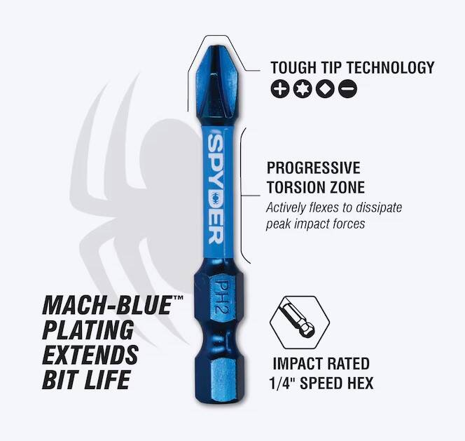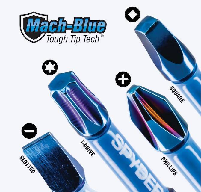 Spyder Mach-Blue™ impact rated driver bits are the durable driving bit for demanding high torque impacting applications. Mach-Blue™ Tough Tip Technology significantly reduces tip wear for reliable fastener driving – up to 70x longer life than other impact rated driver bits. IMPACTive™ alloy tool steel torsion zones actively flex to dissipate peak impact forces, reducing fastener recess damage and preventing tip breakage. Mach-Blue™ driver bits are optimized for use in high torque cordless impacting drivers and drill drivers, making them the pro powered tool that outlasts your workday.