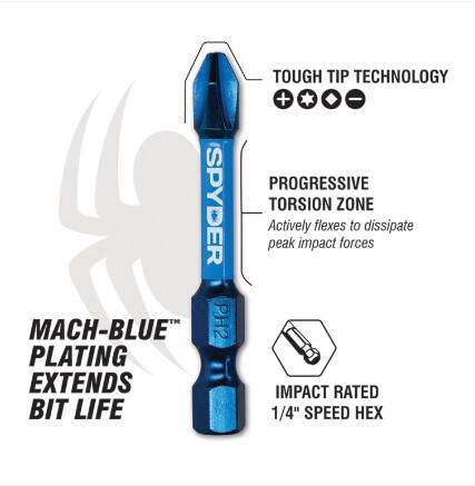 Spyder Stinger™ Mach-Blue™ high speed steel (HSS) drill bits are high-performance metal and wood drilling bits that provide exceptional quality, durability, drilling performance, and value. The Mach-Blue™ surface treatment and advanced M-series alloy tool steel construction retain sharper cutting edges and reduce heat build-up for increased durability, rigidity, and breakage resistance. Spyder Mach-Blue™ impact-rated driver bits are durable driving bits for demanding high-torque impacting applications. Mach-Blue™ Tough Tip Technology significantly reduces tip wear for reliable fastener driving. IMPACTive™ alloy tool steel torsion zones actively flex to dissipate peak impact forces, reducing fastener recess damage and preventing tip breakage. Spyder Mach-Blue™ Drill and Driver Bits are the pro powered tools that outlast your workday.