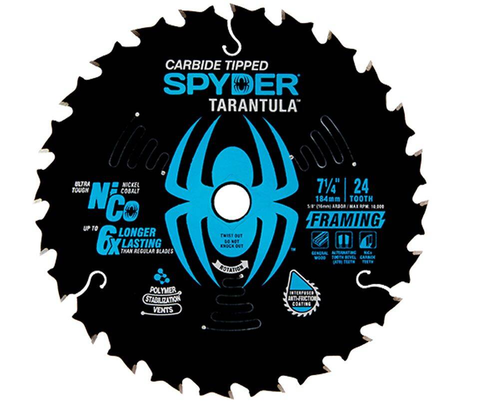 Rip and crosscut with ease with Spyder Tarantula™ Framing circular saw blades. NiCo teeth are sharpened 3x to provide clean cuts and exceptionally long life. Track straight with reduced friction, heat and noise — the Tarantula circular saw blade is the professionals choice for framing and construction. Framing and construction blade is for use in new wood materials. Up to 6x the life of standard carbide blades.