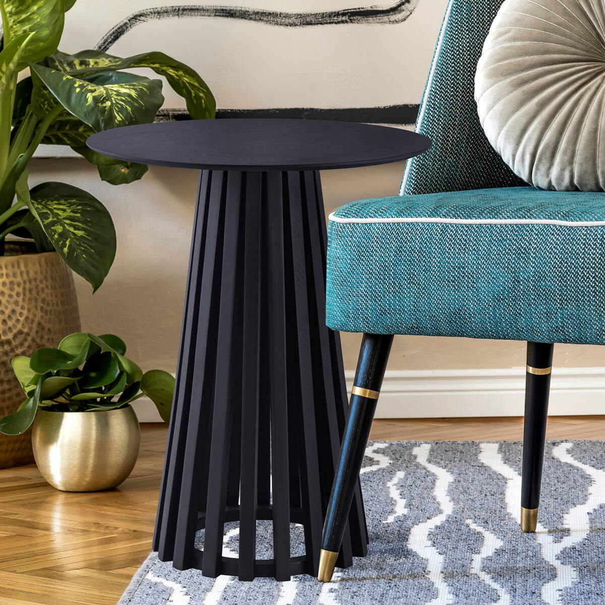 The Lenan Side Table captivates with a compelling design, showcasing a mesmerizing arrangement of gently sloping wood slats that bring both texture and visual intrigue to the forefront. Its sleek black finish elevates its contemporary aesthetic, establishing Lenan as a chic and attention-grabbing centerpiece that effortlessly enhances your living area.