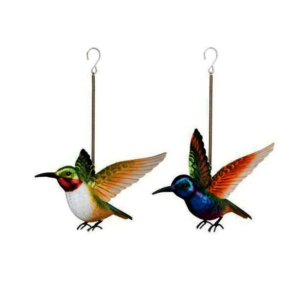 The fascinating humming birds are one the smallest of birds and the most beautiful. Painted in iridescent colors they attach to a metal spring to bounce as the wind blows. They are sold in sets of two.