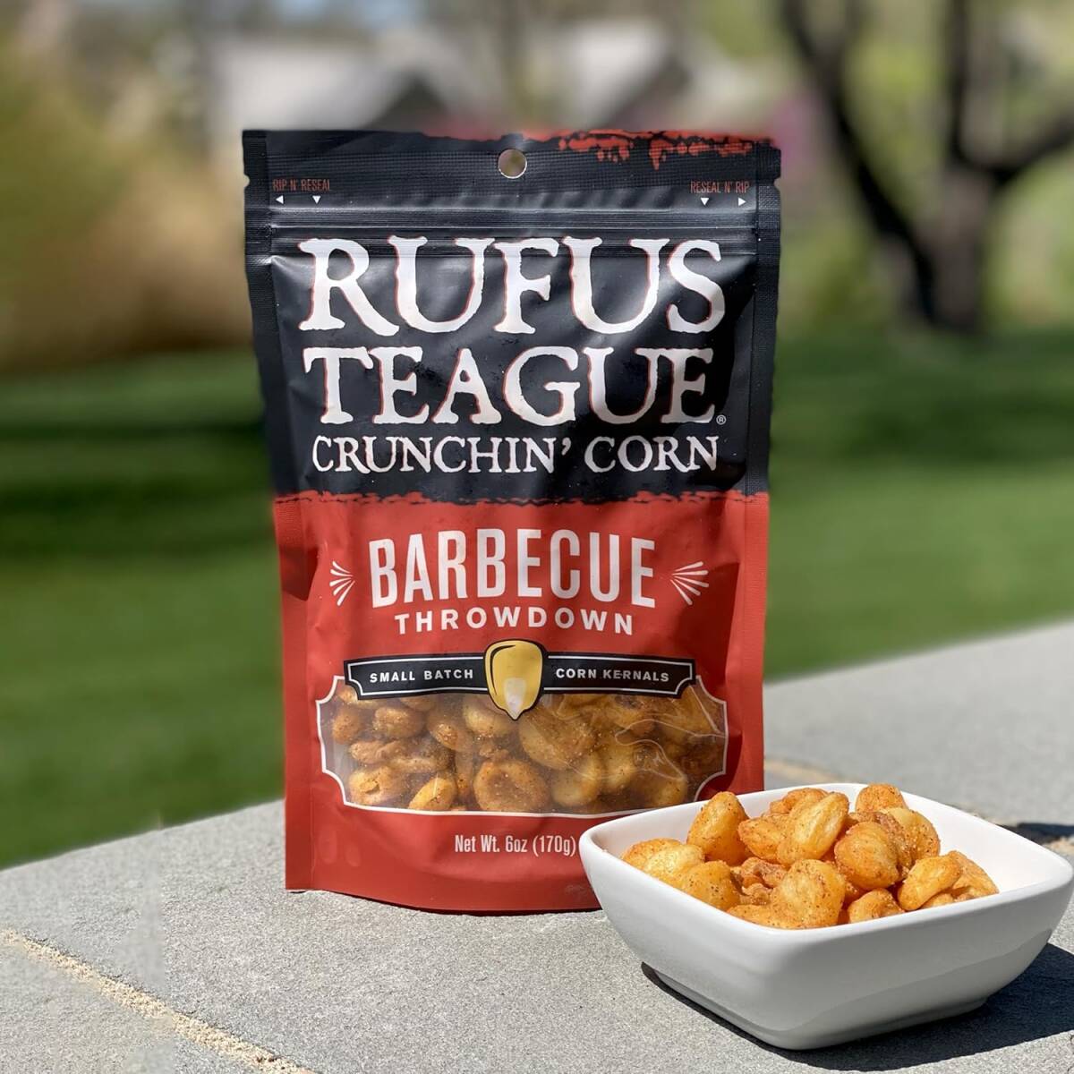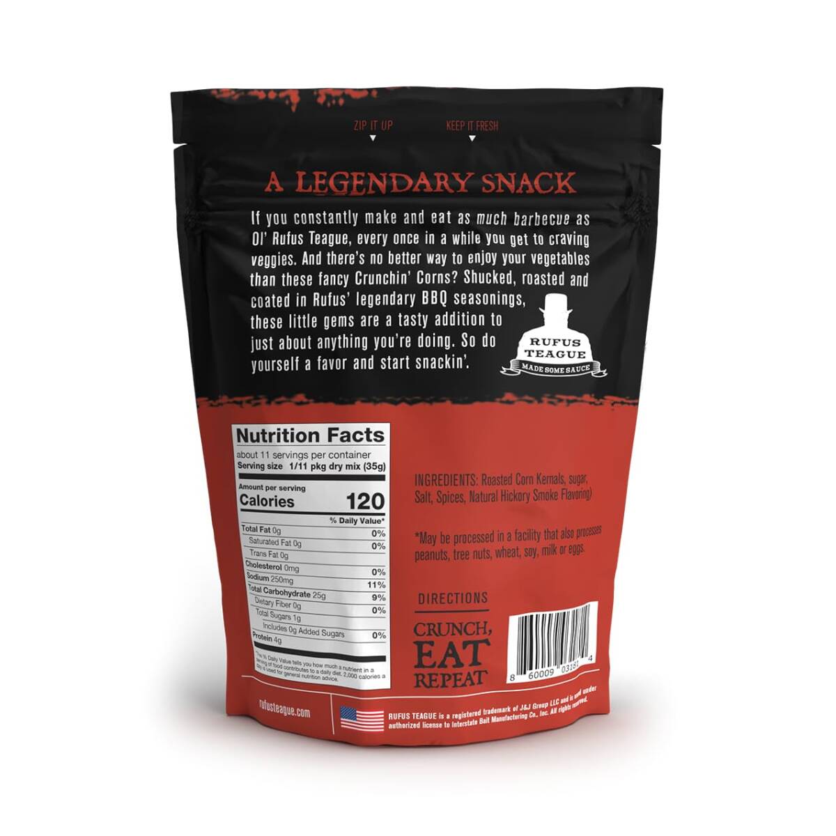 Get a load of these monsters. Our Crunchin' Corns are the best in extra large, roasted corn kernels. Seasoned-up with flavors only Rufus knows how to concoct. You'll immediately know where the name BBQ Throwdown came from with one little taste. Smoky, savory, with a touch of sweetness, it's a flavor that's unmistakably Rufus. Good luck putting these down. You're gonna need it.