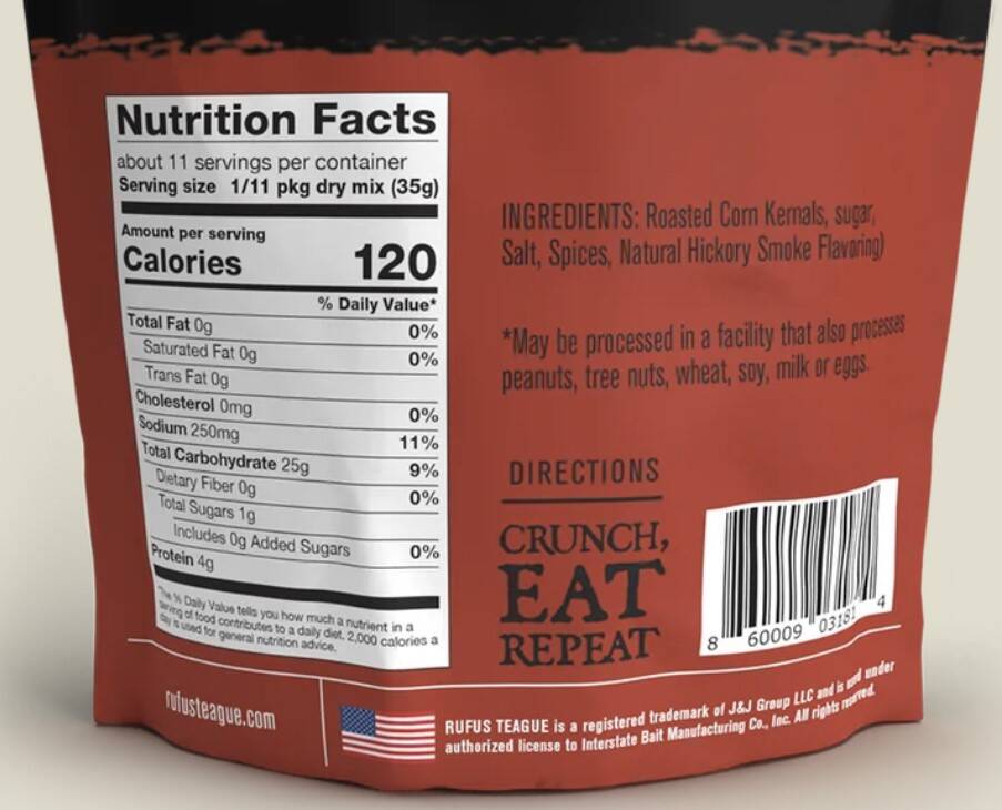 | Ingredients | Roasted Corn Kernals, Sugar, Salt, Spices, Natural Hickory Smoke Flavor |
