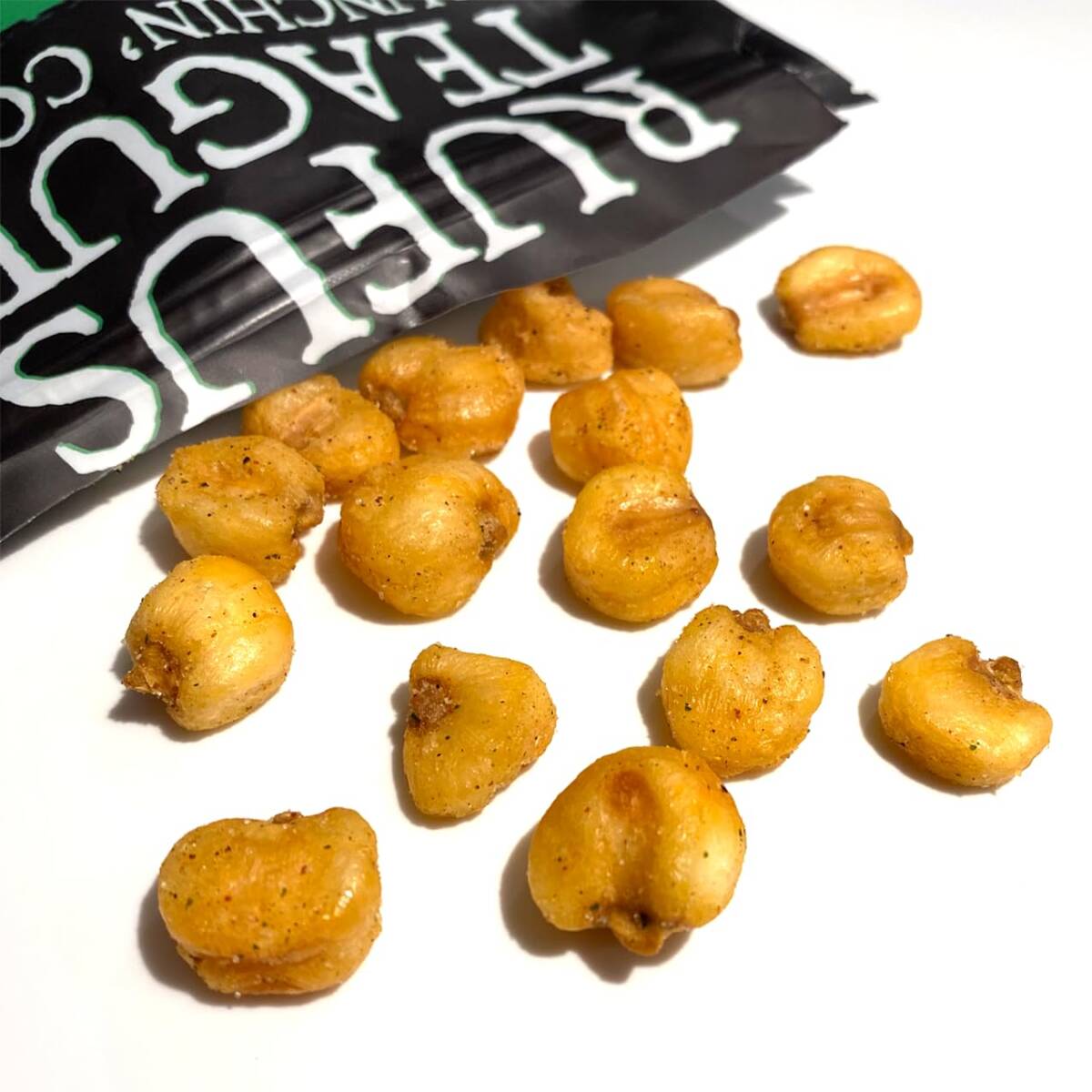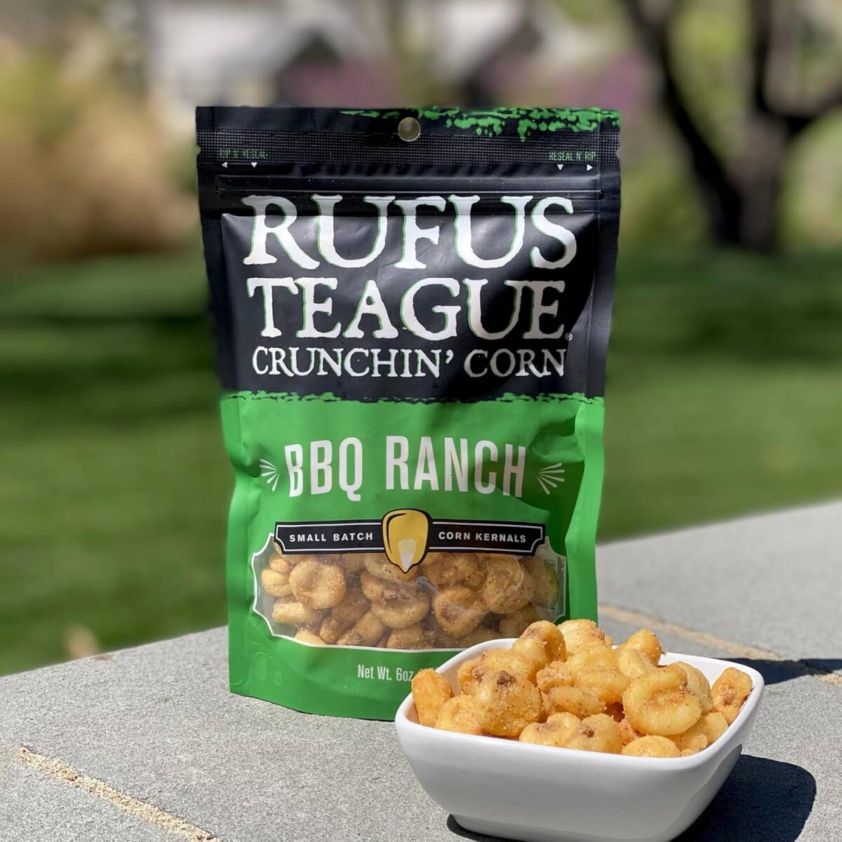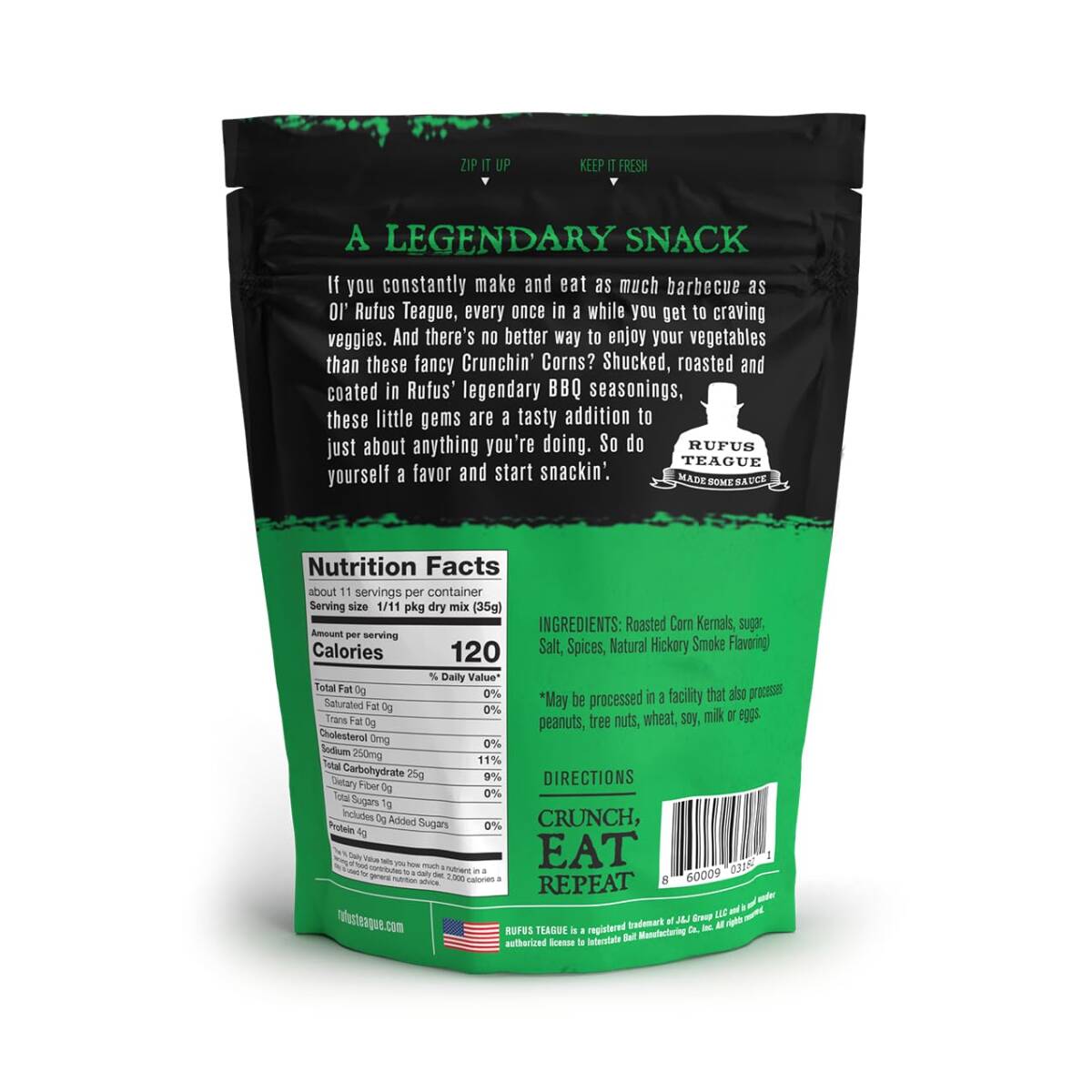 Our Crunchin' Corns are extra-huge, roasted corn kernels with big time deliciousness. Seasoned-up with flavors only Rufus knows how to concoct. The combination of smoky BBQ with a hint of sweetness mix perfectly with the creamy spiced goodness of Ranch to make a snack that will leave you wanting more. And more. And more. And more. And... more.