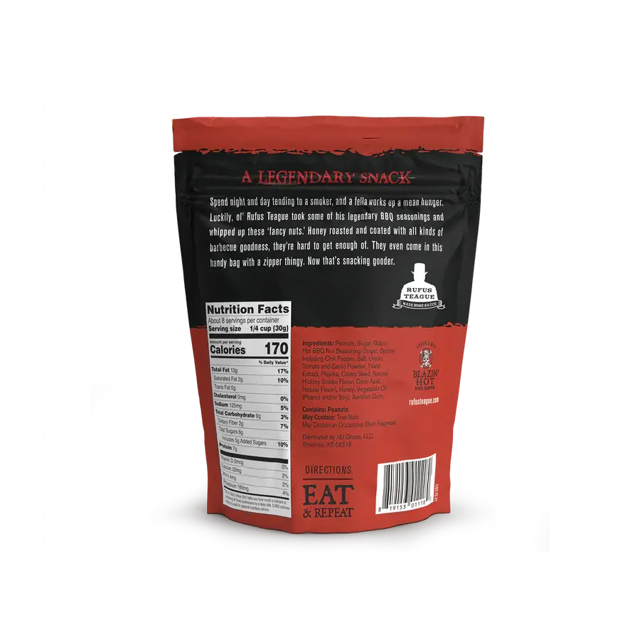 Listen up... these HOT BBQ PEANUTS are pretty dang hot, but not so much that it hides all the other delicious flavors. Rufus took some of his legendary Blazin' Hot BBQ and whipped up these ‘fancy nuts’. He really outdid himself this time. Way beyond tasty, these are truly unbelievable.