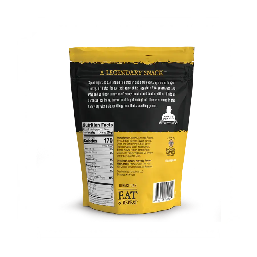 All Rufus Teague Genuine BBQ Nuts are made with premium quality nut varieties and unlike anything you’ve had before. They are not only perfectly honey roasted, but then coated in Rufus’ blend of BBQ goodness. Each comes in a stay-fresh pouch that’s resealable, as long as you can force yourself to stop eating long enough to zip it.