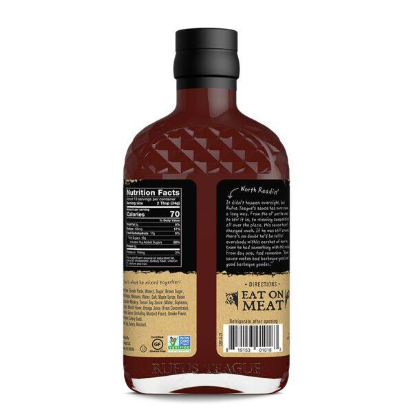 | Ingredients | Tomato Puree (Tomato Paste, Water), Sugar, Brown Sugar, Distilled Vinegar, Molasses, Water, Salt, Maple Syrup, Raisin Paste, Bourbon Whiskey, Tamari Soy Sauce (Water, Soybeans, Salt, Sugar), Natural Flavor, Orange Juice (From Concentrate), Dried Onion, Spices (Including Mustard Flour), Smoke Flavor, Garlic Powder, Celery Seed. Contains: Soy, Celery, Mustard. |
