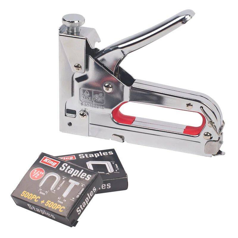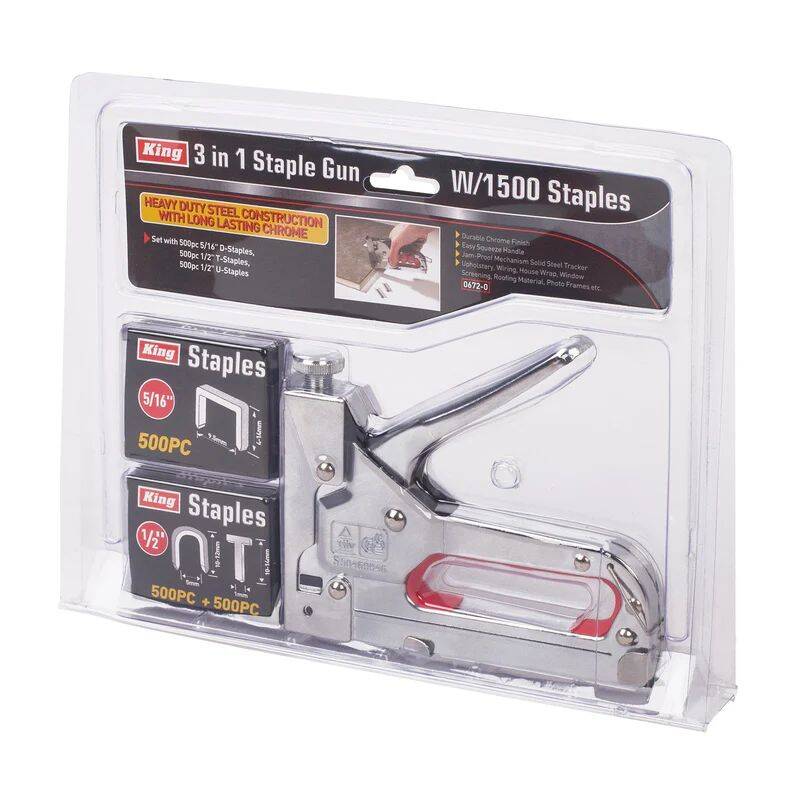 3-In-1 Heavy Duty Staple Gun With 500 Staples. Includes: Heavy duty staple gun; 500 pieces of 5/16-inch D staples; 500 pieces of 1/2-inch T staples; and 500 pieces of 1/2-inch U staples.