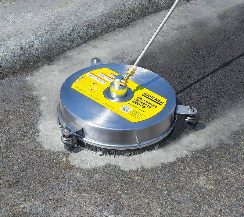Get pro cleaning results with Karcher's 15-Inch Metal Surface Cleaner! Designed for use with cold water, gas pressure washers: 2600 - 4000 PSI, up to 4.0 GPM. The combination of a 15-inch wide cleaning diameter and two spinning spray nozzles work to shorten your overall job time while also minimizing the streaking seen with other cleaning methods. The 3 wheels not only make the unit exceptionally easy to manuever and greatly reduce user fatique during use, they also keep the stainless steel base at a consistent height ensuring uniform cleaning results to take your pressure washing to the next level! A vinyl skirt surrounds the bottom of the unit, keeping the spray focused on cleaning and minimizing splash back to the user and surrounding areas. Includes 1/4-inch Quick Connect fittings and 2 Extension Lances (15-inches each) to quickly and easily customize the length as needed.