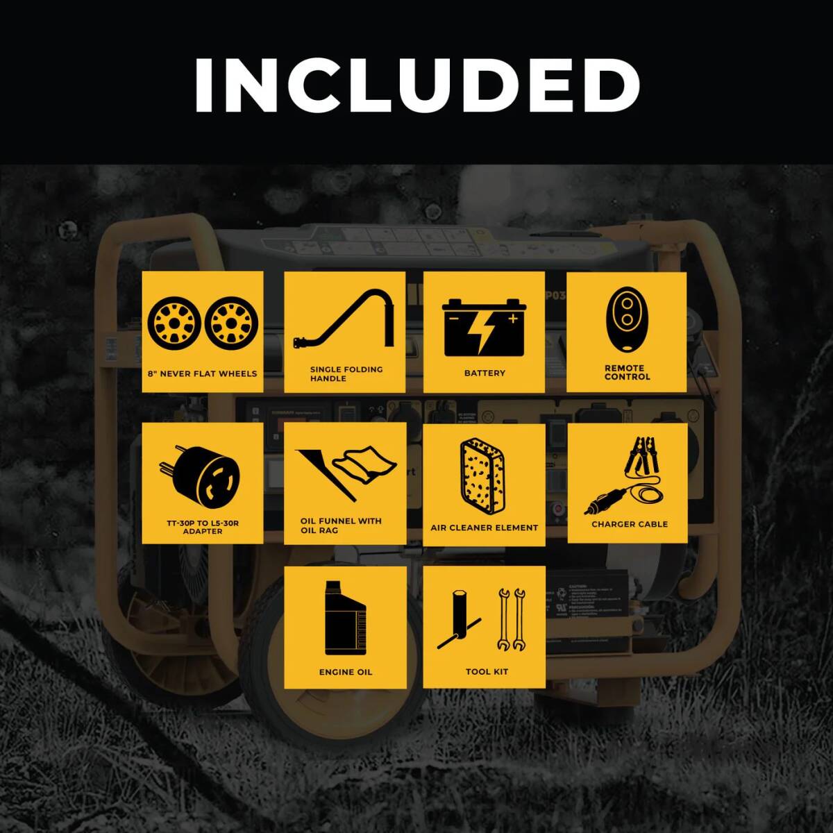 Note: Everything you need to get started is in the box including: oil bottle, funnel, operator's manual and QSSG, remote control and remote holder, maintenance tool kit canister, spark plug, 12V Battery Cable, Adaptor TT-30P to L5-30R.