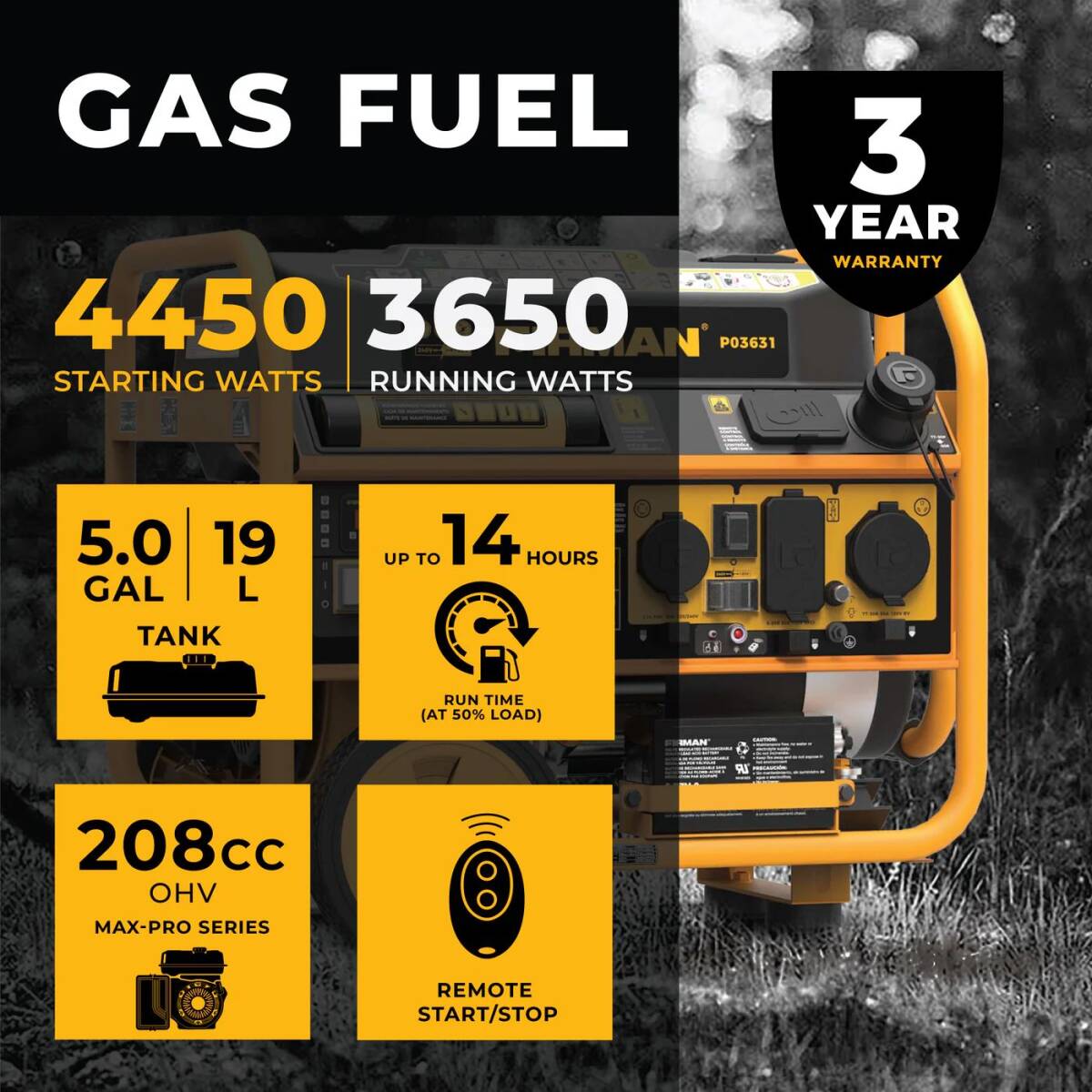 Equipped with 3650 running watts, 4550 starting watts and 120/240V power, this monster has a little bit of everything. Electric and remote start systems, 30A plugs, and RV ready! Its 4-in-1 data minder measuring Volts, Hertz, Hrs and low oil indicator make the P03631 the perfect machine.
