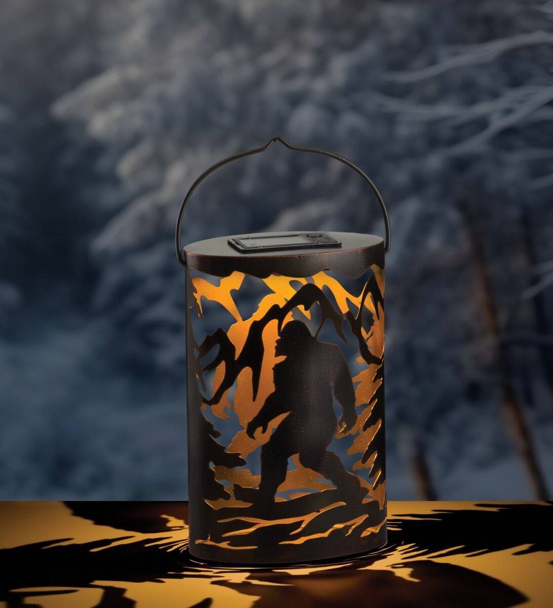 Awesome Sasquatch (Bigfoot) lurking in the woods is framed inside this compact Oval Shadow Solar Lantern. The bronze silhouette image is highlighted at night against the reflective gold paint that is lit up by a solar powered LED light. Makes amazing patterns on the ground or table where it is placed. Comes with a handle for easy carrying or hanging from trees, hooks and Regal's 36" or 48" Shepherd's Hook Stakes.
