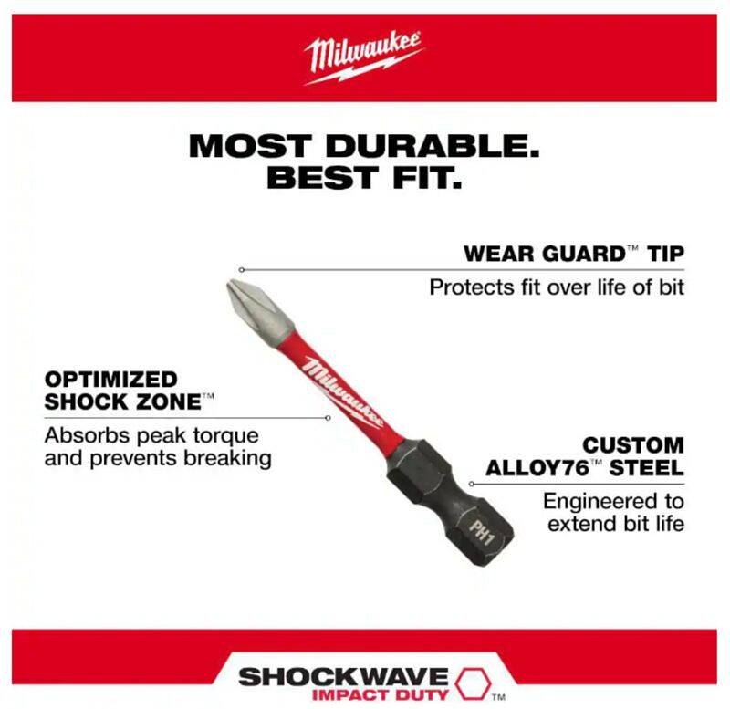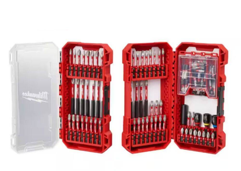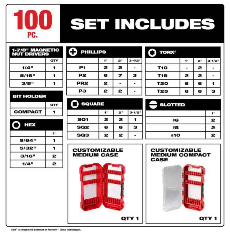Our MILWAUKEE® SHOCKWAVE Impact Duty™ 100PC Driver Bit Set is engineered to be the Most Durable, Best Fitting driver bits on the market. The WEAR GUARD TIP™ delivers increased wear resistance which protects the impact bit's fit over the life of the bit. The SHOCK ZONE™ is optimized for each tip type and length of driver bit in the set to absorb peak torque and prevent breaking. The driver bits are made from CUSTOM ALLOY76™ steel and a proprietary heat treatment process to extend bit life, providing up to 50X life versus other impact driver bits on the market. The Milwaukee® SHOCKWAVE Impact Duty™ driver bits are built to provide users with extreme durability for the most demanding applications. Set is organized in a customizable accessory case designed for use in PACKOUT™.