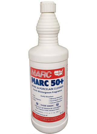 MARC 50+ Bowl & Porcelain Cleaner is a high-strength product which easily dissolves rust, mineral, lime and calcium deposits, scale and hard water stains. The viscous formula allows it to cling to surfaces for enhanced cleaning action. MARC 50+ Bowl & Porcelain Cleaner has a fresh wintergreen fragrance.