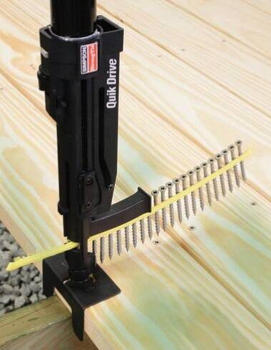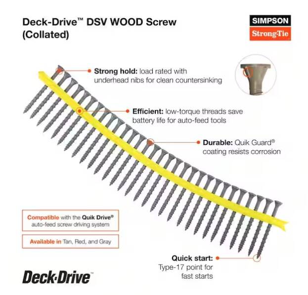 The Deck-Drive DSV Wood screw is a powerful fastening solution for preservative-treated decking applications. With its under-head nibs and fast-start tip, the DSV is ideally suited to be driven and countersunk into today's wood deck boards. The shank is designed to withstand the swelling and shrinkage that is common with fast-growth lumber. Available in hand-drive and in collated strips for use in our Quik Drive® auto-feed screw driving system.