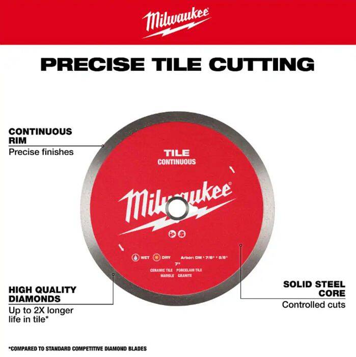 Our Continuous Tile Diamond Blades offer precise tile cutting. The continuous rim provides precise finishes in porcelain, ceramic, marble, and granite. Designed with high-quality diamonds, these blades provide up to 2X longer life in tile. The solid steel core delivers controlled cuts for precise finishes. For use wet and dry.