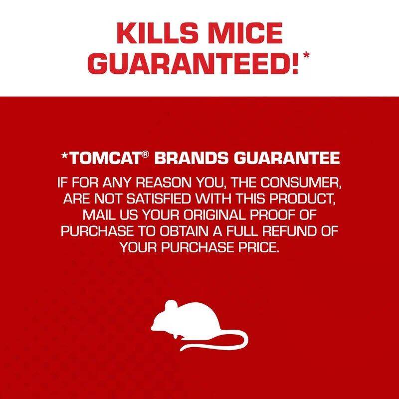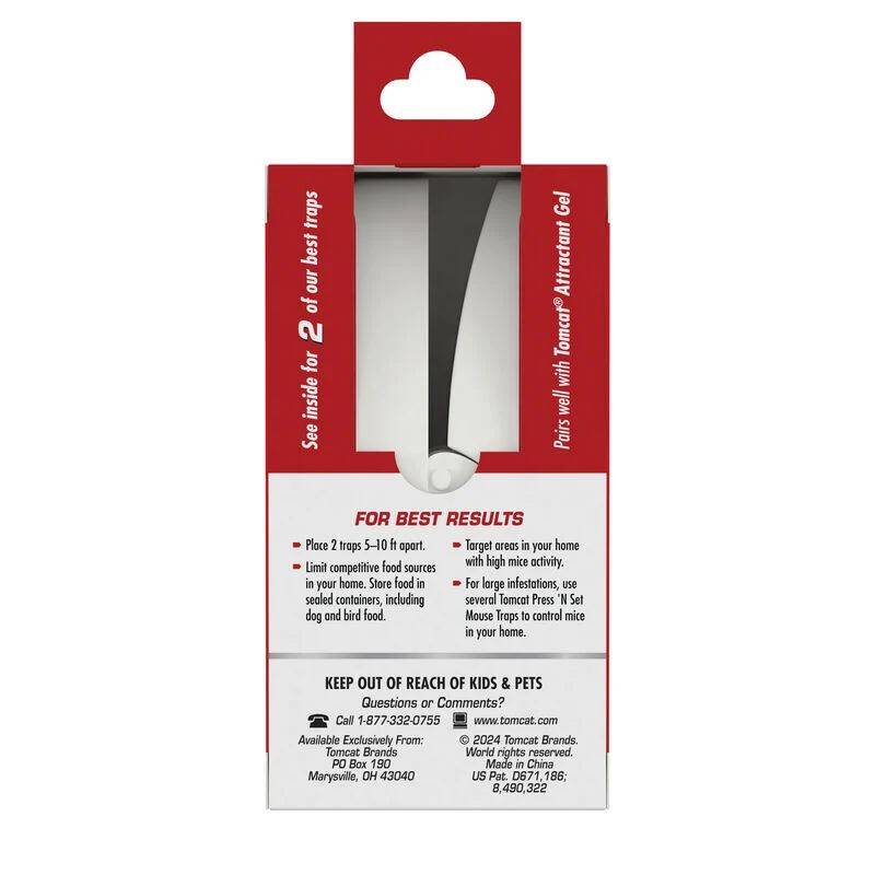 All it takes is one simple set. The Tomcat® Press 'N Set® Mouse Trap is guaranteed* to kill mice and allows for easy, no-touch disposal. These plastic, spring-loaded snap traps are easy to set and reduce the risk of pinched fingers. To use, place a pencil eraser-sized dollop of food such as peanut butter into the bait well. After baiting, pull the set bar back the entire way until you hear a "click" to tell you it is locked. Mice have a natural tendency to run along walls as they move from hiding to feeding, so we recommend placing traps with the bait well facing the walls of rooms or cupboards where activity is suspected, such as kitchens, utility rooms, or garages (droppings and oily marks along baseboards are a telltale sign of activity). Once the mouse has been killed, pick up the trap using the grab tab and dispose of the trap and the mouse in the trash. Your fingers will never touch the dead mouse! This package of Tomcat® Press 'N Set® Mouse Trap contains 2 disposable mouse traps. *Tomcat Brands Guarantee: If for any reason you, the consumer, are not satisfied with this product, mail us your original proof of purchase to obtain a full refund of your purchase price.