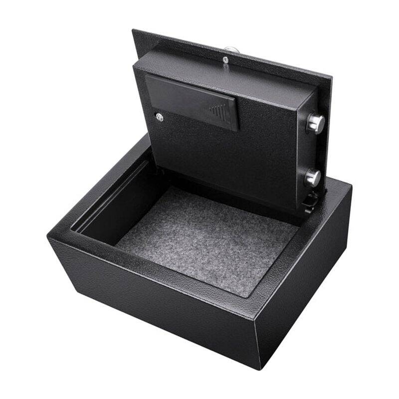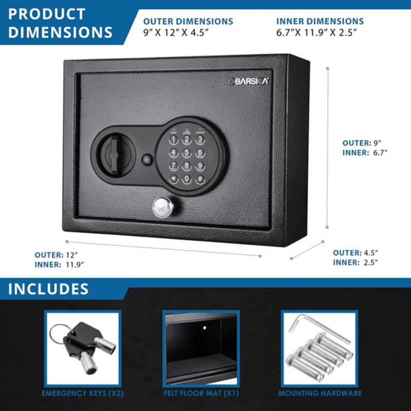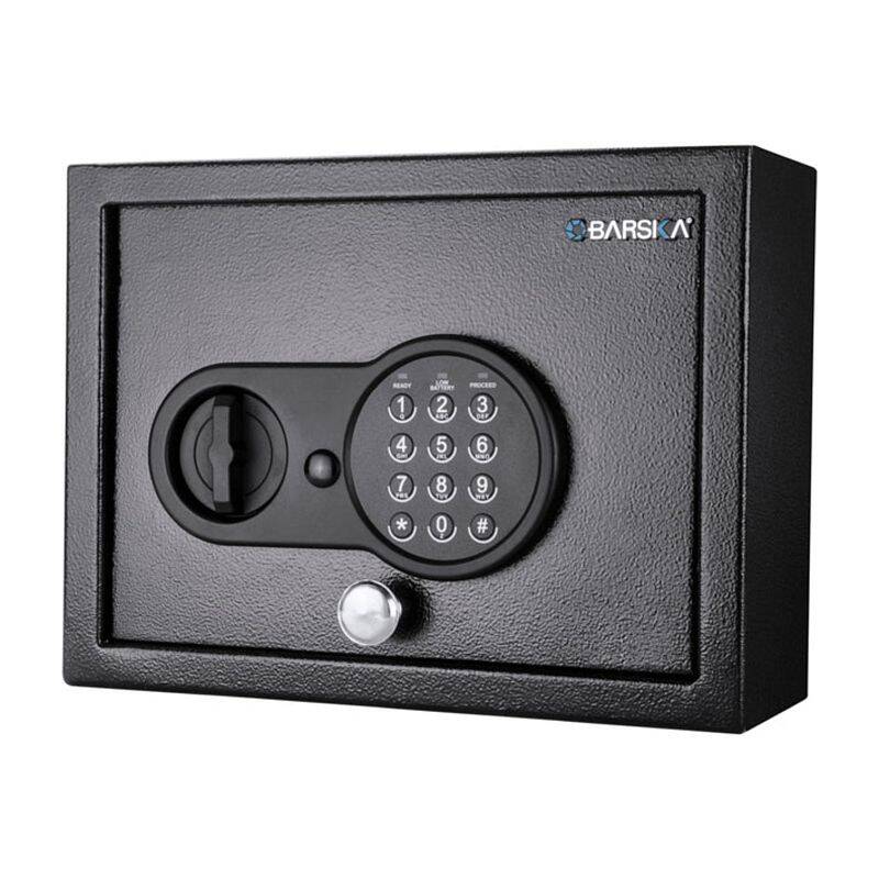 Keep valuables safe and secure with theĀ 0.15 Cu. ft Top Opening Keypad Security Safe by Barska. The spacious dimensions of this safe makes it perfect for storing multiple valuables, such as medicine, money, jewelry, and electronics. The user-friendly digital keypad retains 1 PIN Code for accessing the safe, and can also be opened with the included back-up keys. Two solid steel locking bolts provide extra security against tampering, and 4 mounting holes allow the safe to be secured to a flat surface.