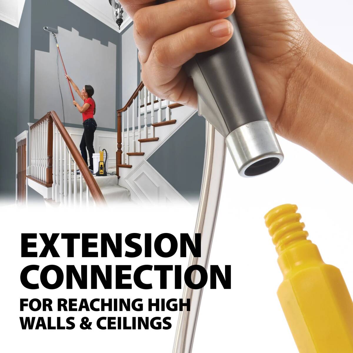 - Extension Connection Handle Accepts Common Threaded Extension Poles To Reach High Walls And Ceilings