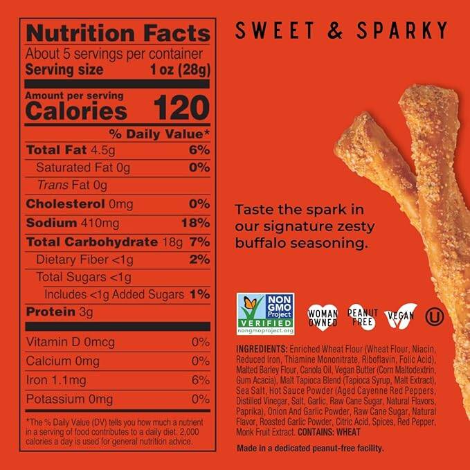 Taste the spark in our signature zesty buffalo seasoning. A delicious flavor combination of sweet and then heat, these vegan pretzel braids pack a punch. Be warned that each crunchy bite will leave you craving more! If you're a fan of spicy snacks, look no further.