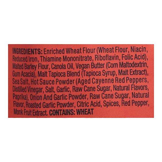 Ingredients Enriched Wheat Flour (Wheat Flour, Niacin, Reduced Iron, Thiamine Mononitrate, Riboflavin, Folic Acid), Malted Barley Flour, Canola Oil, Vegan Butter (Corn Maltodextrin, Gum Acacia), Malt Tapioca Blend (Tapioca Syrup, Malt Extract), Sea Salt, Hot Sauce Powder (Aged Cayenne Red Peppers, Distilled Vinegar, Salt, Garlic, Raw Cane Sugar, Natural Flavors, Paprika), Onion and Garlic Powder, Raw Cane Sugar, Natural Flavor, Roasted Garlic Powder, Citric Acid, Spices, Red Pepper, Monk Fruit Extract