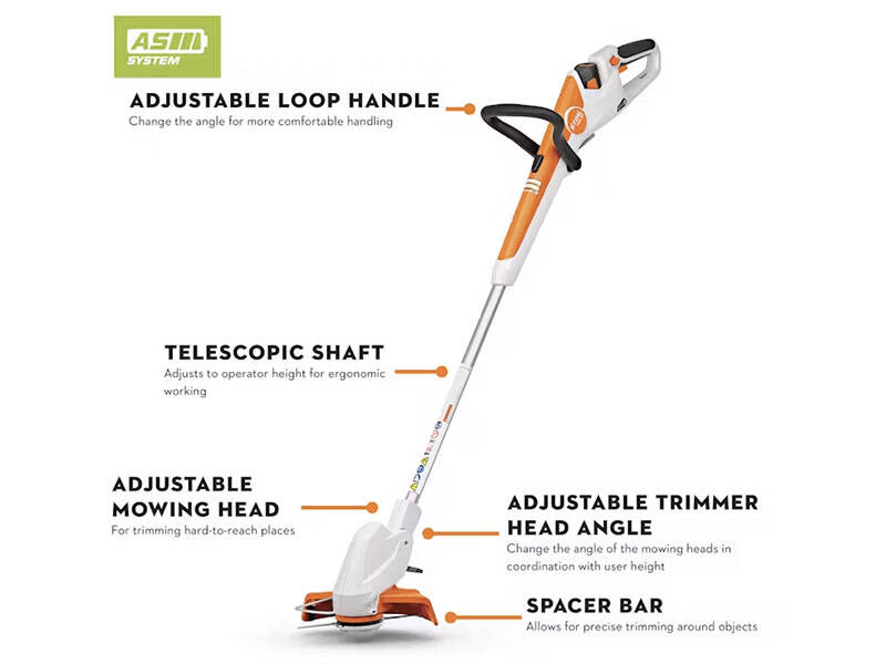 The first 2-in-1 trimmer and edger in the AS Battery System features a telescoping shaft and adjustable mowing head for ergonomic positioning.