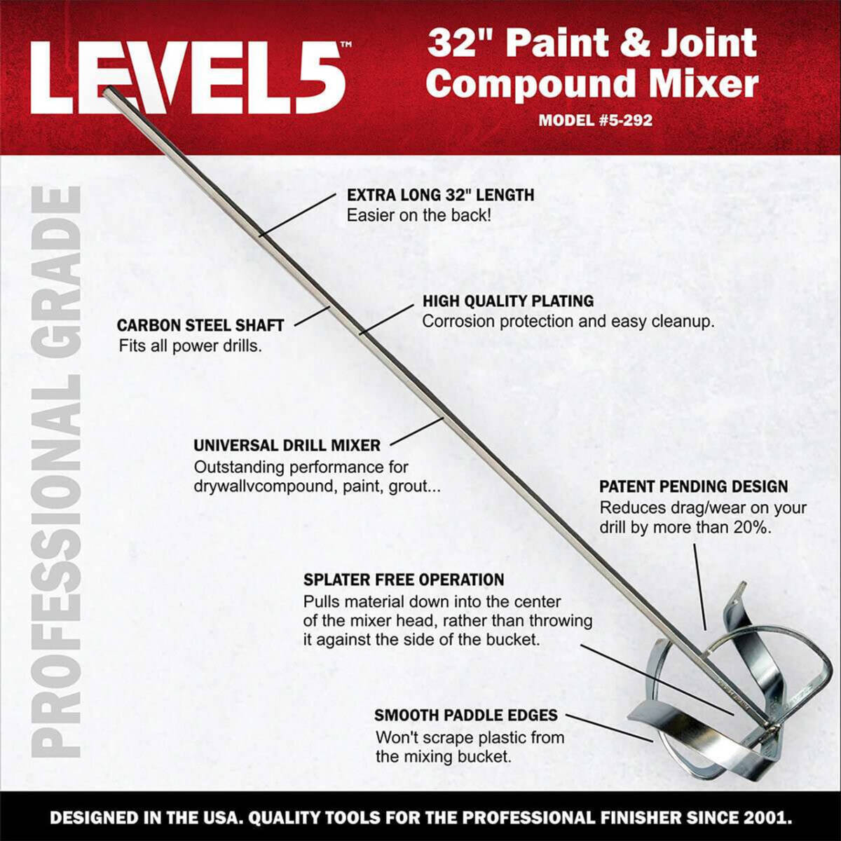 LEVEL5™ paddle mixers have been designed to provide a splatter-free operation which prevents air pocket buildup and reduces stress on your drill by 20%.