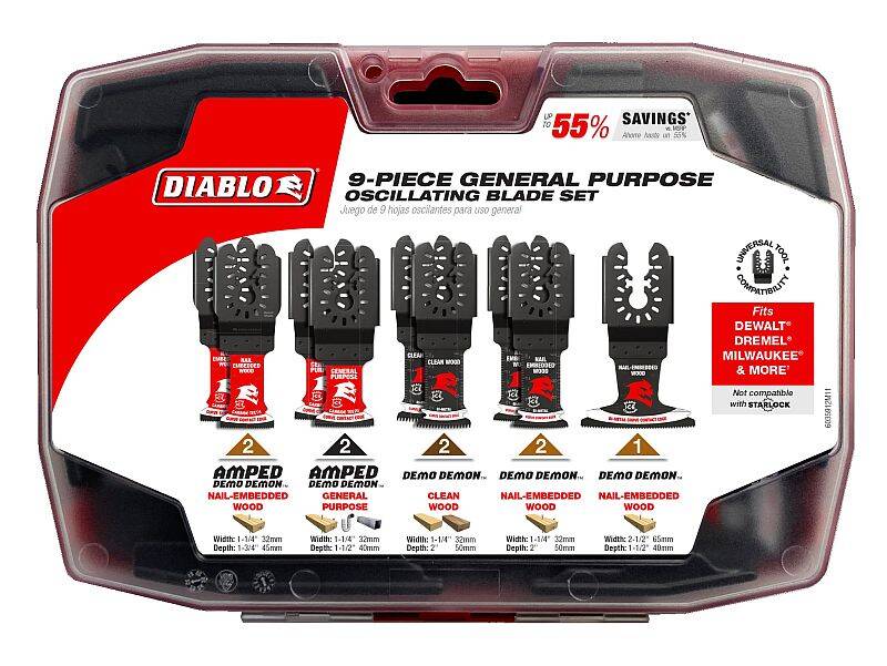 Diablo’s universal fit oscillating blade set features application specific blades ranging from nail-embedded wood, clean wood, metal, plastics and drywall. Included are high-performance TiCo Hi-Density carbide and bi-metal blades sure to deliver unmatched durability, life and quality of cut in any job. The blade’s universal fit, adapter-free design easily attaches to most tools, with the exception of Starlock tools.